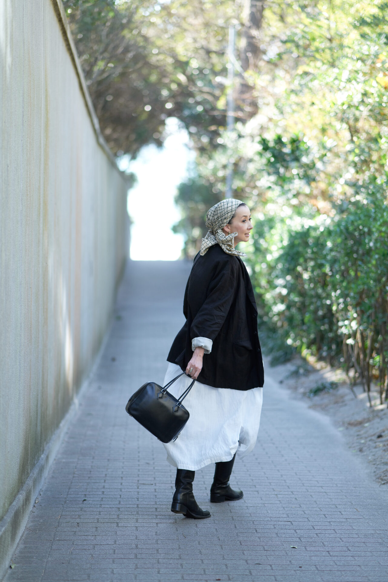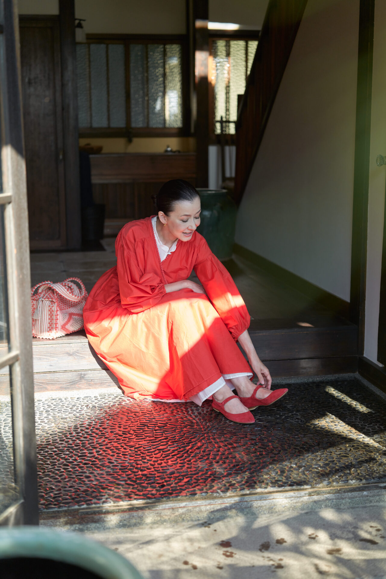 今月号では「三種の神器」としてコーディネートのスパイス役となる、愛用の「鞄・バッグ・靴」を紹介、玄関先で自身のデザインした赤い靴を履く風景や庭先で愛犬トトと遊ぶかれんさん、葉山の海へ出かける風景。いつもの彼女のライフスタイルを葉山の自邸で追いかけた。